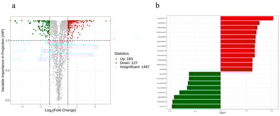 Differential metabolite analysis: (a) Differential metabolic volcano diagram of transgenic plants; (b) Top 20 metabolites in the multiplicity of difference. The horizontal coordinate is the log2FC of the differential metabolite, and the vertical coordinate is the differential metabolite. Red color represents up-regulation of metabolite content, and green color represents down-regulation of metabolite content.