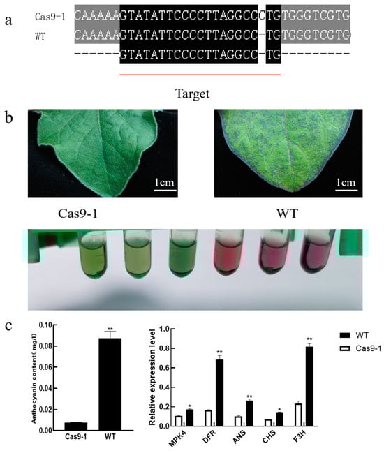 We performed targeted gene editing in ‘LSHX’ eggplant using CRISPR-Cas9. Genomic DNA from T0 generation-positive plants was used as a template for PCR amplification using primers specific for MPK4test-F and MPK4test-R that spanned the target site. Sequencing of the PCR products showed that one plant was a homozygous mutant named Cas9-1 (Figure 7a). In the Cas9-1 mutant, a base insertion occurred at the target site of the SmMPK4.1 gene, resulting in a blockage of the normal translation of the gene. In eggplant, anthocyanin accumulation is regulated by light conditions, and the level of anthocyanin accumulation is positively correlated with the intensity of light. In this study, in order to induce anthocyanin production, we moved eggplant seedlings to be cultured under high-light conditions (10,000 Lux). The results showed that wild-type ‘LSHX’ eggplant leaves could accumulate anthocyanins induced by high-light intensity, but the leaves of eggplant knocked down for SmMPK4.1 did not accumulate anthocyanins under high-light intensity (Figure 7b,c).