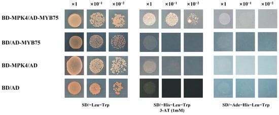 To verify whether SmMPK4.1 could interact with SmMYB75, SmMYB75 was constructed into pGADT7(AD) vector as prey, and SmMPK4.1 was constructed into pGBKT7(BD) vector as bait and co-transformed into yeast AH109 strain, followed by the defective medium (SD/-Trp-Leu-His) that verified their interactions. As shown in Figure 8, the yeast co-transformed with SmMPK4.1 and SmMYB75 could grow on SD-TLH (SD/-Trp-Leu-His) defective medium, indicating that SmMPK4.1 could interact with SmMYB75 in yeast cells.