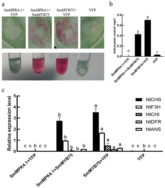 Transient overexpression detection of SmMYB75 and SmMPK4.1 in tobacco: (a) Phenotypes of tobacco leaves after transient overexpression of SmMYB75 and SmMPK4.1 for 3 days; (b) Anthocyanin content; (c) qRT-PCR analysis of tobacco anthocyanin biosynthetic genes: NtCHS (AF311783), NtCHI (AB213651), NtF3H (AB289450), NtDFR (EF421429), and NtANS (AB723683). Empty vector YFP was used as a control. The error line indicates the standard deviation of three biological replicates. Lowercase letters represent the results of One-way ANOVA Duncan test analysis; p < 0.05, indicating significant differences.