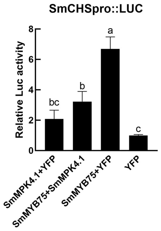 To further verify the interaction between SmMPK4.1 and SmMYB75, transient overexpression experiments were conducted in tobacco. As can be seen in Figure 9a,b, compared with the control group (YFP), the injection of overexpression of SmMPK4.1 alone did not cause changes in leaf color, while the injection of overexpression of SmMYB75 alone caused the leaves to turn significantly purple, proving the increase in anthocyanin content. When SmMPK4.1 was co-injected with SmMYB75, it was observed that the purple color was weakened, and the anthocyanin content was lower than in the case of SmMYB75 alone. To further demonstrate whether SmMPK4.1 with SmMYB75 regulated anthocyanin content by modulating structural genes related to anthocyanin synthesis, we examined the transcript levels of the NtCHS, NtCHI, NtF3H, NtDFR, and NtANS genes using qRT-PCR. As shown in Figure 9c, when SmMPK4.1 was co-overexpressed with SmMYB75, the expression levels of these five anthocyanin-synthesizing genes in tobacco were significantly down-regulated compared to the overexpression of SmMYB75 alone. It indicates that the presence of SmMPK4.1 inhibited the function of SmMYB75 in promoting anthocyanin synthesis in plants. The above results verified the inhibitory effect of SmMPK4.1 on the anthocyanin synthesis function of SmMYB75 and showed that it reduced anthocyanin content by regulating anthocyanin biosynthesis-related genes.