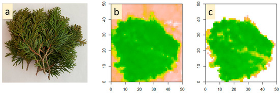Selection ROI. Stack of shoots of T. occidentalis (a), hyperspectral image before (b) and after (c) threshold setting “Carter5 > 1.4”.