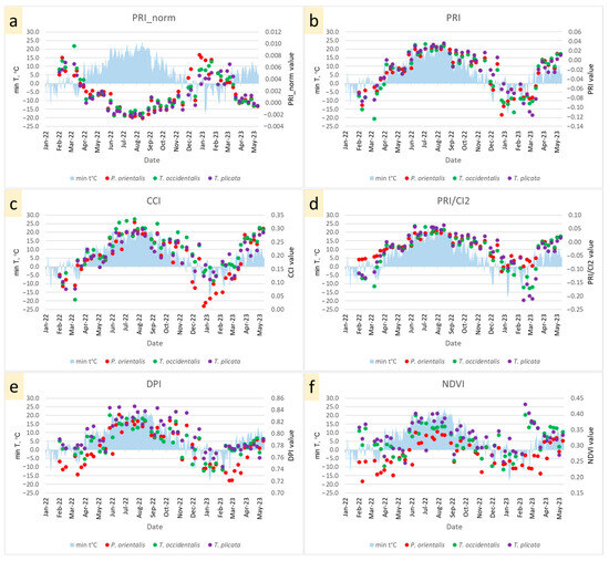 Seasonal dynamics of PRI_norm (a), PRI (b), CCI (c), PRI/CI2 (d), DPI (e), and NDVI (f) values compared to the dynamics of the daily temperature.