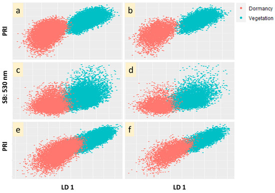 Linear discriminant analysis of two states of P. orientalis: “Vegetation” and “Dormancy”. (a): Using 81 VIs (training set); (b): using 81 VIs (test set); (c): using 125 SB (training set); (d): using 125 SB (test set); (e): using LDA model LD1 = 0.82 PRI − 0.73 PRI_norm − 0.82 D2 (training set); (f) using LDA model LD1 = 0.82 PRI − 0.73 PRI_norm − 0.82 D2 (test set).
