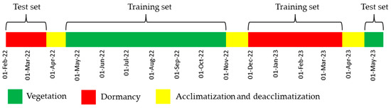 For the test set, the HSI data were also divided into two classes (Figure 5): “Vegetation” class—HSI data obtained in the following calendar dates: 19 April, 26 April, 2 May, and 10 May 2023. “Dormancy” class—HSI data obtained in the interval from 2 February to 23 March 2022.