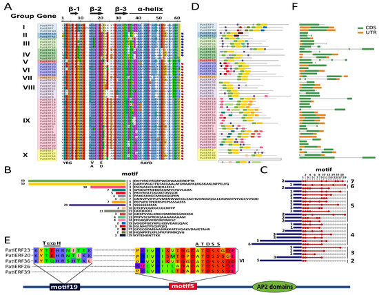 The specificity and positional variability of each motif were observed among different group/subgroup members, resulting in diverse distribution patterns (Figure 2D). Additionally, within the same group of PatiERFs, motifs displayed diversity in their locations, with some fixed on the left part of the gene sequence and others distributed across both ends of the gene sequence (Figure 2D; Table S3). Furthermore, motifs specific to individual gene sequences or families were identified (Table S4). For instance, motif 3 was exclusive to group IX. Among the 19 motifs, motif 9 stood out as the most extensive beyond the AP2 domain, with a higher likelihood of appearing multiple times within the same sequence.