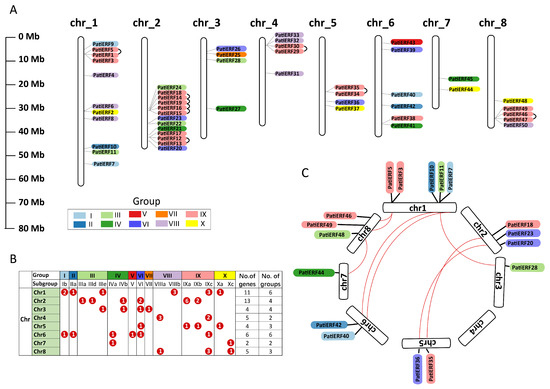 Distribution and homology of PatiERFs on chromosomes (Chr). (A) Distribution of PatiERFs across the sweet cherry genome. The chromosome number is marked on the top of each chromosome. The black arc represents pairs of ERF genes with tandem duplication. (B) Groups/subgroups and the number of PatiERFs on each chromosome. (C) Collinearity of PatiERFs on different chromosomes. The red arc represents pairs of PatiERFs with tandem duplication.