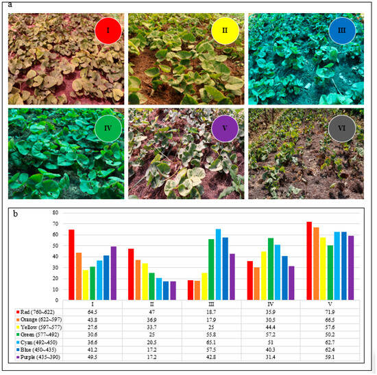 Figure 1. Light quality treatment. (a) Asarum plants growing under filter films with different colors; (b) light quality conditions under different colors. The bars represent the wavelength-permeable rate (%) under different light quality treatments. The roman letters I–VI refer to red, yellow, blue, green, purple, and black (50% sunlight).