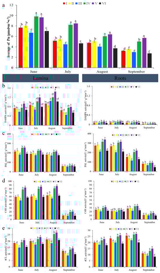 Figure 2. Effect of light quality on Asarum photosynthesis and enzyme activities. (a) The diurnal net photosynthetic rate average of four stages in six light qualities. (b) Activity of 3-deoxy-D-arabino-heptulosonate-7-phosphate synthase (DAHPS), (c) phenylalanine ammonia lyase (PAL), (d) cinnamate-4-hydroxylase (C4H), and (e) 4-coumarate: CoA ligase (4CL) in different tissues of A. heterotropoides var. mandshuricum plants grown in six light irradiations. I, II, III, IV and V are light qualities listed in Figure 1b. VI indicates 50% full sunlight. Error bar represents standard deviation (n = 5); different letters on the bars mean significant difference (p < 0.05).