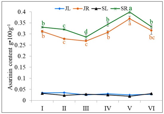 Figure 3. Asarinin content of Asarum heterotropoides var. mandshuricum grown in different light qualities. JL and JR indicate leaves and roots collected in July, respectively. SL and SR indicate leaves and roots collected in September, respectively. I, II, III, IV and V are light qualities listed in Figure 1b. VI indicates 50% full sunlight. Error bar represents standard deviation (n = 3); different letters on the bars mean significant difference (p < 0.05).