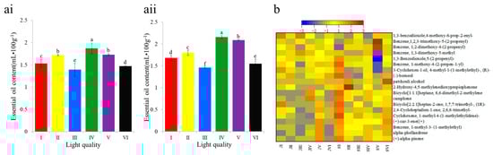 Figure 4. Essential oil content and composition in Asarum roots. Essential oil content in roots collected in (ai) July 2020 and (aii) September 2020. I, II, III, IV and V are light qualities listed in Figure 1b; VI indicates 50% full sunlight; error bar represents standard deviation (n = 3); different letters on the bars mean significant difference (p < 0.05). (b) Differences in the main chemical components of volatile oil in July (J) and September (S) 2020.