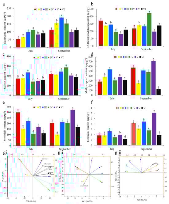 Figure 5. Levels of six essential oil compounds accumulated in Asarum (roots) ground under different light quality treatments during July and September 2020. (a) Eucarvone, (b) 3,5-dimethoxytoluene, (c) safrole, (d) methyleugenol, (e) myristicin, and (f) elemicin. Error bars on the column charts represent standard deviation (n = 3); different letters on the bars mean significant difference (p < 0.05). (g) Principal component analysis of the six essential oil compounds grown under different light quality treatments in July 2020 (gi), August 2020 (gii) and September 2020 (giii). The colors of the arrows indicate the wavelength, as given in Figure 1b.