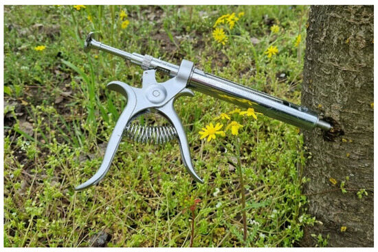 Every tree was drilled with four holes, each measuring 3–4 mm wide in diameter and 40 mm long. The injection points were 20 cm above ground level. A trunk injector (Figure 1) was used to inject the liquid into the xylem with a maximum pressure of 12.6 bar. The injection time required was approximately 5 min per tree and person. The cherry trees were easily injected, and the average pressure was around 8 bar. In 2021, 10, 20, or 40 mL pesticides were injected into the trees and evenly distributed into the drilled holes. For 10 mL volume, 2.5 mL/hole, for 20 mL, 5 mL/hole, and for 40 mL, 10 mL/hole. In 2022, the same amount (40 mL) was injected into every tree but with different pesticide dosages (Table 1). After the injections, the wounds were closed with tree gel (a water-based, air-drying paste for tree wounds; FAGEL, Fenylakk Kft.). In both years, the control trees were injected with 40 mL of water. The injection treatments occurred on 12 May in sunny weather for both years (BBCH 73).