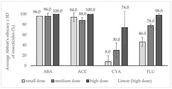 Average Abbott’s efficacy for insecticides (%); injected small dose: 0.18 g/tree ABA, 0.2 g/tree ACE, CYA, and FLU; medium dose: 0.36 g/tree ABA, 0.4 g/tree ACE, CYA, and FLU; and high dose: 0.72 g/tree ABA, 0.8 g/tree ACE, CYA, and FLU. SD: standard deviation.
