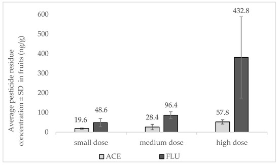 Average pesticide residue concentration in fruits (ng/g). Dose 1: 0.056 g/tree of ACE and 0.33 g/tree of FLU; dose 2: 0.56 g/tree of ACE and 0.66 g/tree of FLU; dose 3: 1.12 g/tree of ACE and 1.21 g/tree of FLU; and dose 4: 2.25 g/tree of ACE and 3.96 g/tree of FLU. SD: standard deviation.