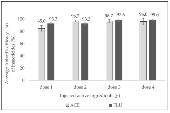 Average Abbott’s efficacy of insecticides (%). Dose 1: 0.056 g/tree of ACE and 0.33 g/tree of FLU; dose 2: 0.56 g/tree of ACE and 0.66 g/tree of FLU; dose 3: 1.12 g/tree of ACE and 1.21 g/tree of FLU; and dose 4: 2.25 g/tree of ACE and 3.96 g/tree of FLU. SD: standard deviation.