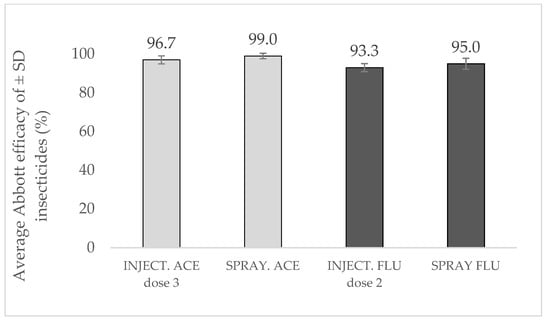 It is important to compare the efficacy of trunk injection with spray treatment, where we must pay attention to the dosage. Injected ACE dose 3 (1.12 g ACE/tree) was compared with sprayed ACE (1 g ACE/tree). FLU dose 2 (0.6 g FLU/tree) was compared with the sprayed dose (0.6 g FLU/tree) (Figure 4 and Figure 6).