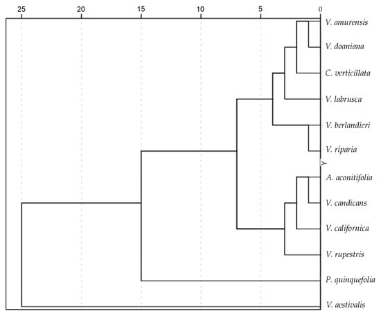 The dendrogram in Figure 3 shows the hierarchical relationship between species. The species of Vitis are categorized into two main groups, with five and three species, respectively. The position of V. aestivalis outside of these two groups requires further confirmation. In the major group, V. riparia and V. berlandieri appear closely related, while V. amurensis and V. doaniana are close together in another branch.