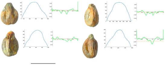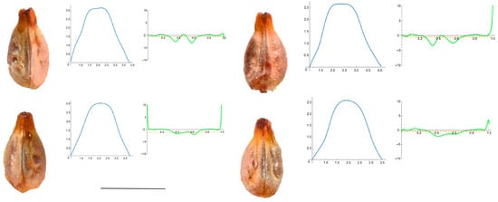 Figure 4 shows the images of four seeds of A. aconitifolia with the Bézier curves representing their apex and the corresponding curvature values. Similar figures were obtained for the other species in this group (Figure A1, Figure A2, Figure A3, Figure A4 and Figure A5 in Appendix A).