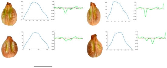 This group is composed of V. aestivalis, V. berlandieri, V. candicans and V. rupestris. Seed images, Bézier curves and curvature values for V. aestivalis are shown in Figure 5, and for the other three species they are shown in Figure A6, Figure A7 and Figure A8 in Appendix A.