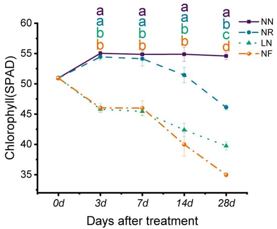 The SPAD value is usually used to assess the chlorophyll content in plant leaves, and the relative concentration of chlorophyll is directly related to the nitrogen content of leaves []. No obvious differences were observed during the whole growth periods in the NN treatment. The SPAD values of the LN and NF treatments showed a significant decline from the third day, reaching their lowest point on the 28th day. The SPAD value of the NR treatment began to decrease after 7 d. The SPAD values under LN and NF treatments exhibited a statistically significant decrease compared with those under the NN and NR treatments. Specifically, on the 28th day, the SPAD values under the NR, LN, and NF treatments were 15.5%, 30.4%, and 35.9%, respectively (Figure 2).