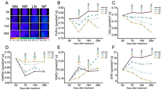 Additionally, the quantum yield of the regulatory energy dissipation of PSⅡ (Y(NPQ)) is often used to evaluate the dissipation of excess excitation energy []. After 7 d of NF, LN, and NR treatment, the Y(NPQ) values of banana leaves exhibited a statistically significant increase in comparison with those of leaves in the NN treatment. Following a duration of 28 d of treatment, the leaf Y(NPQ) values in the NN and NR treatments remained relatively stable, ranging from 0.65 to 0.70. Conversely, the LN and NF treatment maintained more than 0.70 of Y(NPQ) (Figure 3D). The Y(NO) parameter serves as an indicator of the self-protection mechanism of plants in response to intense light exposure. Specifically, the Y(NO) value of banana seedling leaves subjected to LN treatment was significantly higher level compared with that of those treated with the other three treatments on day 28, as depicted in Figure 3E. In conclusion, under low nitrogen stress, the excitation energy of banana seedlings showed higher activity, indicating that the plants were in the process of adaptation and regulation of light energy use.