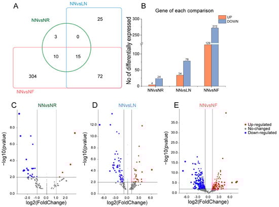 Screening of DEGs in response to N stress. (A) Venn diagram of DEGs; (B) number of DEGs; (C) volcano map of DEGs from NN vs. NR; (D) volcano map of DEGs from NN vs. LN; (E) volcano map of DEGs from NN vs. NF.