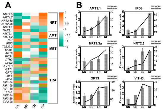 Expression profiles of N-related differential genes. (A) Heatmap of expression pattern; (B) results of qRT-PCR. NRT: nitrate transporter; AMT: ammonium transporter; MET: nitrogen metabolism-related genes; TRA: transport-related proteins.