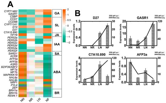 Expression profiles of phytohormone-related DEGs. (A) Heatmap of expression pattern; (B) results of qRT-PCR. GA: gibberellins; SL: strigolactone; JA: jasmonic acid; IAA: auxin; SA: salicylic acid; ABA: abscisic acid; BR: brassinolactone.