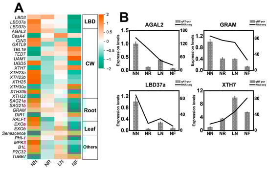 Gene expression characteristics of DEGs associated with plant growth. (A) Heatmap of expression pattern; (B) results of qRT-PCR. LBD: lateral boundary domain proteins; CW: cell wall development-related genes; Root: root growth-related genes, Leaf: leaf growth-related genes; Others: other growth-related genes.