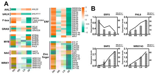 Expression profiles of transcription factors. (A) Heatmap of expression pattern; (B) results of qRT-PCR.