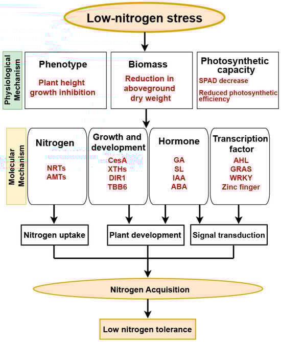 In the current investigation (Figure 9), it was observed that banana seedlings exhibited a response to low nitrogen stress characterized by the inhibition of shoot growth and dry matter accumulation. Root growth was facilitated by enhancements in the root uptake variable area and a reduction in nutrient demand in shoots. Insufficient nitrogen led to a decrease in SPAD value in leaves, thereby impeding photosynthetic efficiency. Low nitrogen stress also triggered the up-regulation of genes associated with plant hormones including GA, SL, IAA, and ABA, as well as the activation of transcription factors such as AHL, GARS, WRKY, and Zinc fingers. The enhanced nitrogen absorption of plants was facilitated by the up-regulation of nitrate transporters (NRT1.7, NRT2.3a, NRT2.3b, and NRT2.5) and ammonium transporters (AMT1.2 and AMT3.1). Additionally, the regulation of structural genes such as CesA and XTH can promote root growth, expanding the nutrient uptake area and enhancing the adaptability of banana plants to low-nitrogen environments. Furthermore, the establishment of a symbiotic relationship with arbuscular mycorrhizal fungi (AMF) can further enhance nutrient uptake, as evidenced by the up-regulated expression of IPD3. Therefore, plants respond to low nitrogen stress by modulating plant hormone levels and inducing the expression of crucial transcription factors.