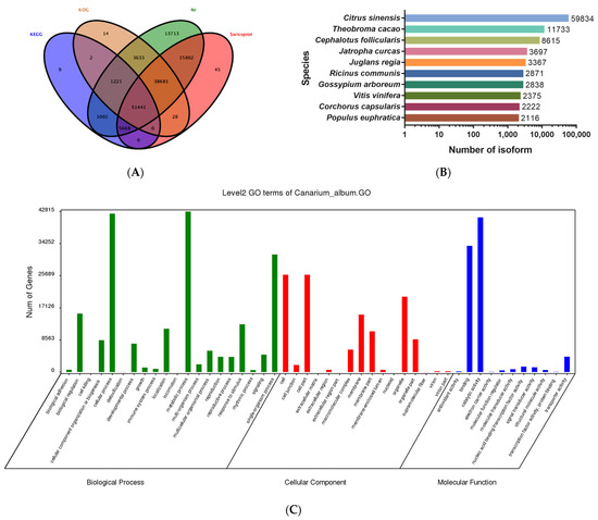 All full-length isoforms were analyzed based on Blastx (E-value ≤ 10−5) searches against the public database to predict the function of these unigenes. According to the results of four database annotations (Figure 2A, Table S4), up to 131,258 isoforms (96.91%) were annotated for function. The number of isoforms assigned to these four databases ranged from 59,342 (43.81%, KEGG) to 131,160 (96.84%, Nr). As shown in Figure 2B, Citrus sinensis has the highest similarity to C. album with 59,834 isoforms (45.62%), followed by Theobroma cacao (8.95%) and Cephalotus follicularis (6.57%). We allocated 70,942 isoforms (52.38%) to GO databases, which were distributed across three main categories: biological process (49.49%), cellular component (29.38%), and molecular function (21.13%) clusters, and further classified them into 47 subcategories (Figure 2C). The candidate genes involved in metabolic and cellular processes of the biological process were the most represented, followed by the catalytic activity of the molecular function. In addition, 95,019 isoforms (70.16%) were allocated to KOG databases (Figure 2D). Among the 25 KOG categories, general function prediction only represented the largest group (33,501 genes, accounted 17.74%), followed by signal transduction mechanisms (25,560, 13.54%) and posttranslational modification, protein turnover, and chaperones (21,886, 11.59%). Moreover, 111,664 isoforms (82.45%) and 59,342 isoforms (43.81%) were allocated to the Swiss-Prot and KEGG databases, respectively (Table S4).
