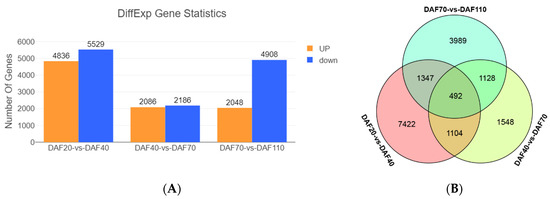 Analysis of differentially expressed genes (DEGs) among the DAF20 vs. DAF40, DAF40 vs. DAF70, and DAF70 vs. DAF110 groups. (A) Statistical analysis of DEGs at different developmental stages of C. album fruit. (B) Venn diagram showing the distribution of DEGs.