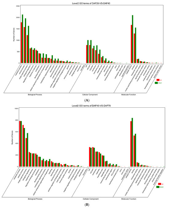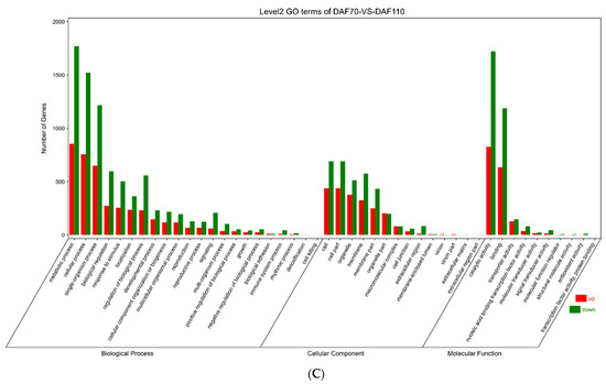 GO enrichment analysis of DEGs. Three main categories of GO category enrichment analysis of DEGs in groups of DAF20 vs. DAF40 (A), DAF40 vs. DAF70 (B), and DAF70 vs. DAF110 (C).