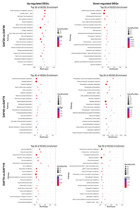 KEGG pathway enrichment analysis of DEGs. The Top20 pathways with the most significant q-value in the DAF20 vs. DAF40, DAF40 vs. DAF70, and DAF70 vs. DAF110 groups. Up-regulated DEG pathway enrichment analysis based on the differentially up-regulated genes in each comparison group. Down-regulated DEG pathway enrichment analysis based on the differentially down-regulated genes in each comparison group. In the bubble diagrams, the ordinate is KEGG pathways, and the abscissa is the enrichment factor (the number of differences in the KEGG pathway divided by all the quantities; the magnitude represents the quantity; the redder the color, the smaller the p value).