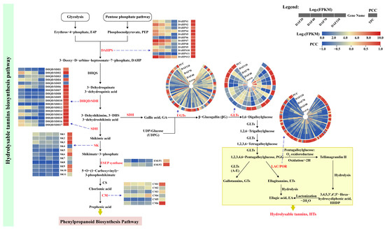 Polyphenol metabolism mainly includes three main biosynthetic pathways: the hydrolysable tannin (HT) biosynthesis pathway, the phenylpropanoid biosynthesis pathway, and the flavonoid biosynthesis pathway, which also refers to the biosynthesis of hydrolysable tannins (HTs), lignins, lignans, flavones, flavonols, anthocyanins, and condensed tannins (CTs). Among them, the HT biosynthesis pathway is a branch of the shikimic acid pathway. Here, we analyzed DEGs related to polyphenol biosynthesis pathways in C. album fruits and their expression patterns at four developmental stages. We further analyzed the three main metabolic pathways.