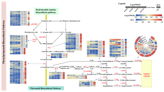 Analysis of DEGs involved in the HT biosynthesis pathway in C. album fruit. In the metabolic pathways, the enzymes marked in red indicated that their coding genes were differentially expressed. The heatmap of DEGs encoding each enzyme is shown near the enzymes. The gene expression was based on the log2(FPKM) value. FPKM was the mean of three replicates. The Pearson correlation coefficient (PCC) was used to measure the correlation between the expression of DEGs and TPC. The names of genes in the signaling pathway are presented in the abbreviation list. The solid arrow represents the pathway, the dashed arrow leads to the differentially expressed genes of enzymes in that pathway, and the yellow-green bold arrow represents the explanatory role. This is also applicable to the image that follows.
