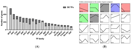 Distribution and trend analysis of TF families in C. album. (A) The top 20 TF families and differentially expressed TFs distribution in C. album. According to the C. album SMRT data, the top 20 TF families with the largest number were predicted and their number distribution of differential expression in the RNA-seq. (B) Trend analysis was conducted for all differentially expressed TFs, divided into 20 profiles. They are sorted by the number of genes (bottom left), from the most to the least. The clustered profiles with p-value ≤ 0.05 were considered significant and are colored.