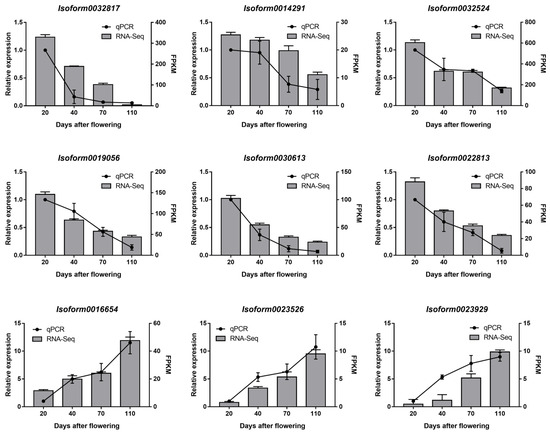 To confirm the accuracy of the transcriptome data, we randomly selected nine DEGs in C. album fruit for analysis by RT-qPCR in a biologically independent experiment. We determined the gene expression level and compared it with RNA-Seq data. As shown in Figure 10, the results showed a high degree of consistency, which proved that the transcriptome data were reliable and highly reproducible.