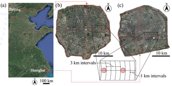 Schematic diagram of the two sample cities in China and the layout of the sample sites. (a) Sample sites in part of a China map (image downloaded from Google Earth Pro). (b) Beijing, China. (c) Shanghai, China. A red dot is a sample site; a red circle or line is the fifth ring road or the outer ring road, respectively.