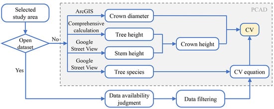 Research on the concept of CV can be traced back to the 1980s, which mainly focused on the measurement methods of CV and the ecological benefits of urban green space [20,21]. On a global scale, CV research involves studying the services provided by urban trees in a certain area or using models to assess urban forest structure and ecosystem services in multiple cities [15,22]. Allometric equations are used as a nondestructive method for estimating urban tree biomass and carbon storage [23]. LiDAR data are a valid source for estimating the CV of individual street trees. For example, waveform LiDAR provides information spanning from the top of a canopy down to the ground, vividly showing the complexity of urban vegetation [24]. Terrestrial laser scanning (TLS) has been used to produce high-resolution 3D vegetation maps. Field measurements at larger sites have also demonstrated that TLS data are more consistent and accurate than manual methods [25,26]. Airborne laser scanning (ALS) can measure canopy height and estimate canopy density, while ground-based calibration is necessary to reduce bias [27]. In recent years, it has been more convenient to acquire high-resolution aerial image data to dramatically improve the efficiency of the ecological evaluation of street trees [28,29]. The accuracy of the point cloud model of a single tree established using Unmanned Aerial Vehicle (UAV) tilt aerial photography technology can meet the requirements of calculating tree height and CV in forest surveys [30,31]. It has lower data collection costs, higher spatial resolution and improves the accuracy of CV estimation [32,33,34,35,36].