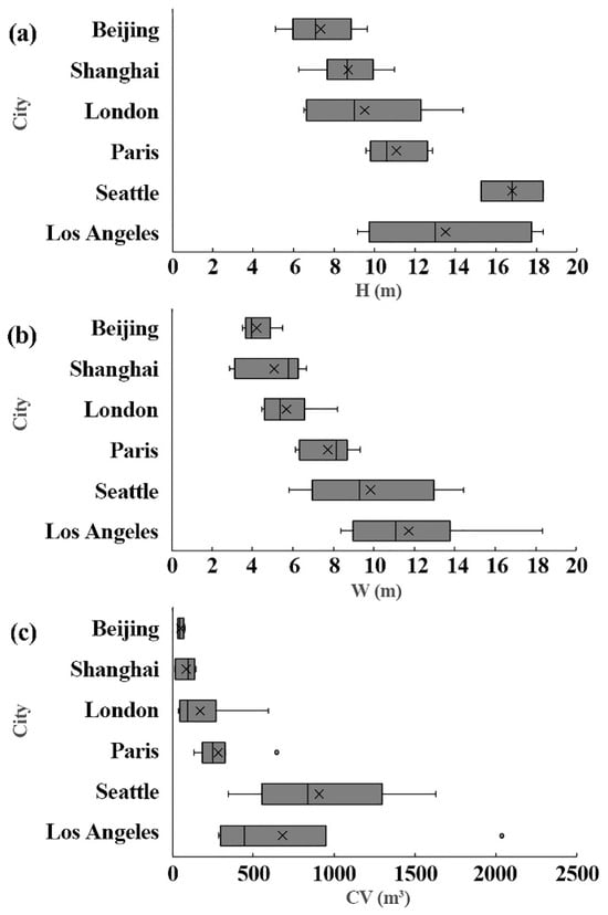 H—tree height; W—crown diameter; CH—crown height; V—crown volume (CV). The data for Paris in 2021 were sourced from the Paris Open Data website (https://opendata.paris.fr/, accessed on 11 August 2022.). The data for London in 2021 were sourced from the London government website’s street tree map (https://apps.london.gov.uk/street-trees/, accessed on 11 August 2022.). The data for Los Angeles in 2021 were sourced from the statistics of TreePeople (https://www.treepeople.org/, accessed on 8 August 2022.), but it was processed data, making it impossible to determine the number of street trees. The data for Seattle in 2022 was sourced from the Seattle Open Data website (https://public.tableau.com/app/profile/city.of.seattle.transportation/viz/SDOTTreeSelector/Dashboard, accessed on 15 July 2022.), but it was processed data, making it impossible to determine the number of street trees.