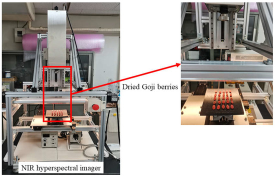 All experiments were carried out on 15–16 July 2021 at the Near-Infrared Hyperspectral Laboratory, Graduate School of Bioagricultural Sciences, Nagoya University, Furo-cho, Chikusa-ku, Nagoya, Japan. It was very important to ensure that all dried Goji berries were completely dried in the experiments. At the same time, in order to study the NIR hyperspectral characteristics of dried Goji berries under different moisture levels, it was necessary to design different temperature gradients. Therefore, according to the Agricultural Industry Standard of the People’s Republic of China NY/T2966-2016 “Technical Specifications for Wolfberry Drying” (2016) issued by the Ministry of Agriculture of the People’s Republic of China, 250 regular and undamaged Goji berries were selected as the samples to be dried and tested under three gradients of 50 °C, 65 °C, and 80 °C. All Goji berries were processed in strict accordance with the above-mentioned standards. That is, all Goji berries were continuously dried in the dryer for 20 h at the specified temperature. During this time, the moisture of each dried Goji berry was measured every two hours. To be specific, a Mettler balance was used to weigh the berries each time, and the difference between the two times was the moisture content. Then, they were tested with a NIR hyperspectral imager, as shown in Figure 1.