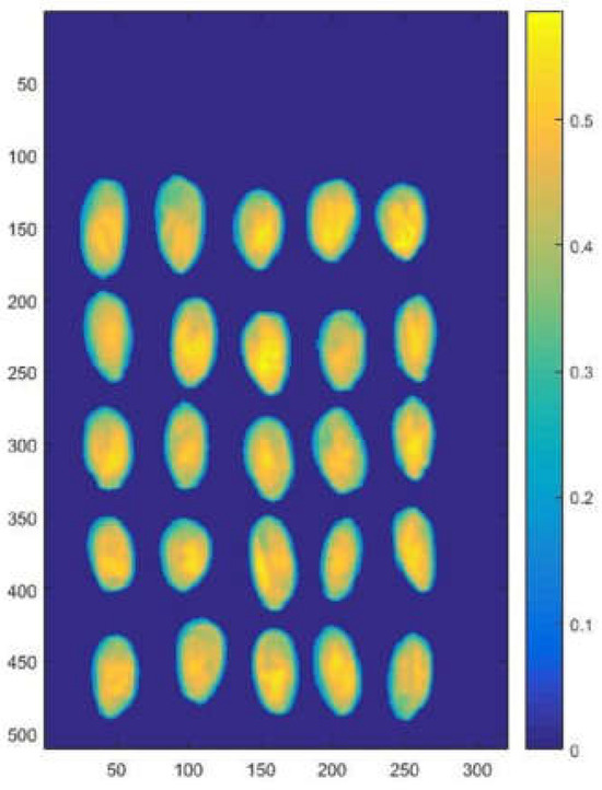 In order to construct an accurate prediction model for the moisture content of dried Goji berries, it was necessary to make use of the characteristics of NIR hyperspectral data. Therefore, it was necessary to process NIR hyperspectral data first. Firstly, in the MATLAB software, the invoking function of NIR hyperspectral data for the moisture of dried Goji berries was compiled. In other words, NIR hyperspectral data were obtained by using the Specim_ReadRaw function. As all suffixes of obtained NIR hyperspectral data were .raw, only data with the same suffix were invoked during the invoking process. However, before processing the NIR hyperspectral data, it was necessary to find the segmentation values of the background and dried Goji berries so as to segment dried Goji berries from the background one-by-one and carry out the following processing. Through repeated tests, on the basis of the NIR hyperspectral image of the 30th band of dried Goji berries, it was easy to segment the dried Goji berries from the background. Therefore, the Image_band function was used here to create a new matrix of NIR hyperspectral data. However, as the NIR hyperspectral data were three-dimensional, it was necessary to carry out dimensionality reduction. In the MATLAB software, the reshape function is a function that can transform a specified matrix into a matrix of a specific dimensionality and ensure that the number of elements in the matrix remains unchanged. This function can readjust the numbers of rows, columns, and dimensionalities of a matrix. Using the reshape function for dimensionality reduction could effectively retain the characteristics of NIR hyperspectral data. Here, the reshape function was used to reduce three-dimensional NIR hyperspectral data into two-dimensional NIR hyperspectral data. Then, it was necessary to find the segmentation value of the background and dried Goji berries. Here, a rectangular frame was first used to separate the dried Goji berries from the background, and the Imagesc function was used for imaging in the MATLAB software, as shown in Figure 2. In the MATLAB software, the Imagesc function can convert the value of elements in a matrix into different colors according to its size and stain the corresponding positions of the coordinate axis with this color. This allows for more intuitively observing the size of each element’s numerical value and discovering its boundary value. At the same time, in imaging process, the axis image command was used to lock the coordinates of the image. This could ensure comparison under the same coordinate scale, and it was easier to find the segmentation values for the background and dried Goji berries.