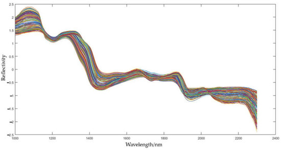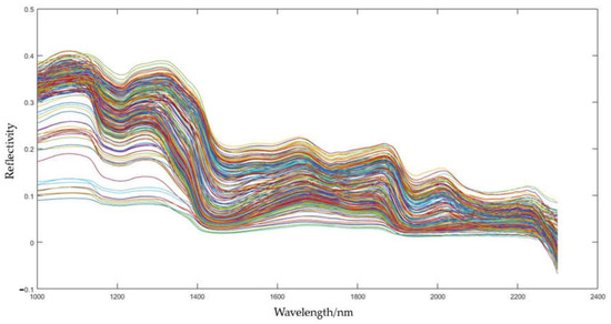 On the basis of obtaining average NIR hyperspectral data, an analysis was carried out. Here, average NIR hyperspectral data could be also referred to as the reflectivity. The plot function was used to plot the wavelength as the horizontal coordinate and the reflectivity as the vertical coordinate, as shown in Figure 3.