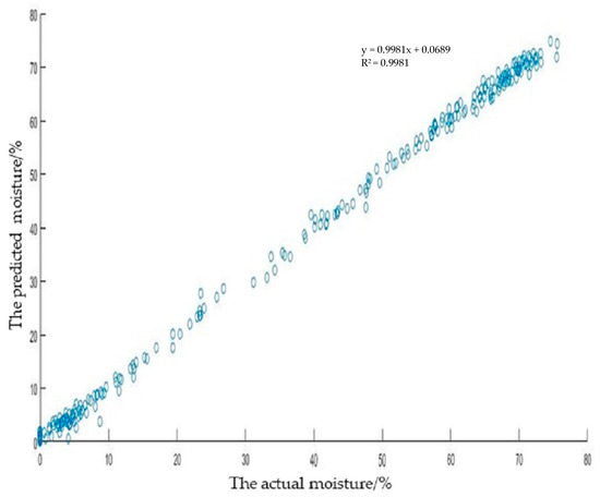 The research and development of non-destructive detecting equipment for the moisture content of dried Goji berries was based on the establishment of an accurate prediction model for the moisture content of dried Goji berries. The PLS algorithm is a nonlinear algorithm, generally referred to as the PLS algorithm. It uses the least-squares regression method to fit data by minimizing the residual sum of squares. In previous studies, some researchers used the PLS algorithm to model NIR hyperspectral data and predict the moisture [22]. They achieved good prediction results. In the experiments, NIR hyperspectral data were obtained using a NIR hyperspectral imager, and the corresponding relationship between NIR hyperspectral characteristics and the moisture content was intended to be found in the obtained NIR hyperspectral data. Therefore, the PLS algorithm could be used for the establishment of an accurate prediction model. First, NIR hyperspectral data after SNV were extracted using the MATLAB software. Then, PLS modeling was carried out between NIR hyperspectral data after SNV and the moisture content. It could be known from the program that PLS modeling was conducted between the NIR hyperspectral data after SNV and the moisture content. Since the number of dried Goji berries for the PLS modeling was 250, the PLS parameter was set to 250. In the process of PLS modeling, because BETA was a relational parameter, the coefficient whose first row in BETA was similar to the intercept. It was necessary to create a new Excel sheet and set all the first columns to 1, thus creating a new matrix named Data_original_with_BETA. Then, the moisture content of dried Goji berries was predicted. The predicted moisture was obtained by multiplying the newly created matrix named Data_original_with_BETA by the relational parameter BETA. Finally, the actual and predicted moisture contents of dried Goji berries were processed in the MATLAB software to plot a scatter graph of the actual and predicted moisture contents of dried Goji berries, as shown in Figure 5.