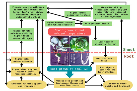 Under cool-RZT, the photosynthetic efficiency and final production yield of subtropical and temperate vegetable crops were enhanced remarkably compared to the whole plants grown under hot ambient temperatures [16,17,18]. Our studies showed that cool-RZT alternates the partitioning of mineral nutrients uptake by the roots [63]. In response to the changes in RZT, the partitioning of photoassimilates produced in the leaves was also altered to meet changes in shoot and root nutrient demands [72]. Cool-RZT also alleviates the negative effects of hot-ambient-RZT on NO3− assimilation and the coordination of carbon and nitrogen metabolism [53]. Studies conducted in the tropical greenhouse revealed that cooling the RZT of subtropical and temperate vegetable crops alleviated both stomatal and non-stomatal constraints on photosynthesis, including reductions in chlorophyll content, photosynthetic light use efficiency, Rubisco protein content, and maximum Rubisco activity, irrespective of hot ambient temperatures [17,18]. Studies conducted by other researchers have also shown that RZT affects photosynthesis and assimilate partitioning [61,73]. Through the mitigation of high-temperature stress on root and shoot growth and development and various physiological processes (Figure 1), subtropical and temperate vegetable crops can now be grown all year round through cooling only the RZ in a tropical greenhouse.