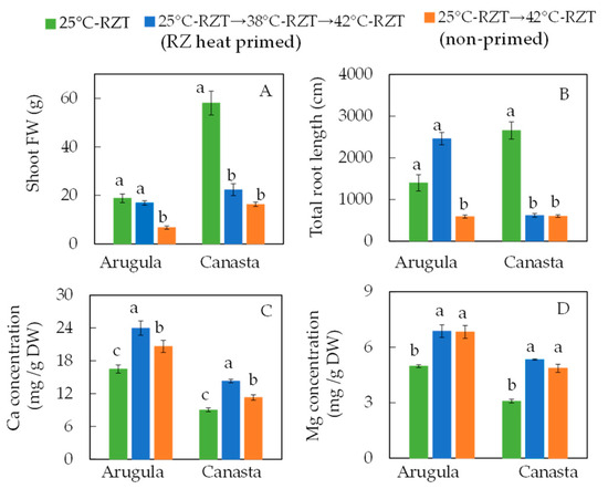 Shoot FW (A), total root length (B), concentrations of Ca (C) and Mg (D) of arugula and canasta at harvest (36 days after transplanting). The vertical lines through the means represent standard errors (n = 4). Different lowercase letters are statistically different (p < 0.05, Tukey’s multiple comparison test). Each species was analyzed separately. 25 °C-RZT: plants were kept at a constant 25 °C-RZT for 24 h daily for 36 DAT (days after transplanting); 25 °C-RZT→38 °C-RZT→42 °C-RZT (RZ heat priming): plants were grown at a constant 25 °C-RZT, 24 h daily for the first 10 days, then subjected to fluctuating hot A-RZT with a constant 38 °C-RZT maintained from 1100 to 1700 h for 6 h daily from 11 to 20 DAT and then exposed to fluctuating hot A-RZT with a constant 42 °C-RZT maintained for 16 days from 1100 to 1700 h for 6 h daily; 25 °C-RZT→42 °C-RZT (non-priming): plants were grown at a constant 25 °C-RZT 24 h daily for 20 days and for the last 16 days were transferred to fluctuating hot A-RZT with a constant 42 °C-RZT maintained from 1100 to 1700 h for 6 h daily (Modified from He et al. [20].