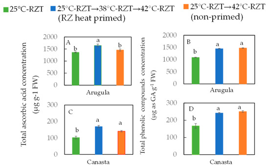 Total ascorbic acid (A,C) and total phenolic compounds (C,D) concentration of arugula and canasta at harvest (36 days after transplanting). The vertical lines through the means represent standard errors (n = 4). Different lowercase letters are statistically different (p < 0.05, Tukey’s multiple comparison test). Each species was analyzed separately. Refer to Figure 2 for the details of different RZT treatments (Modified from He et al. [20]).